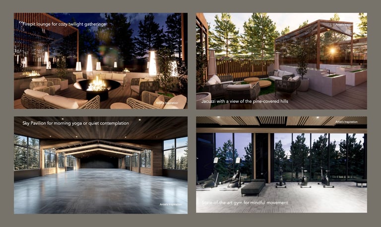 Residents are welcomed by a sophisticated lobby with curated interiors, complemented by private lounges and elegantly appointed function spaces ideal for intimate gatherings. A fully equipped fitness center supports a balanced lifestyle, while landscaped gardens and scenic viewing areas provide serene spaces to unwind in the crisp mountain air.