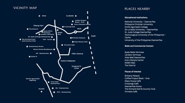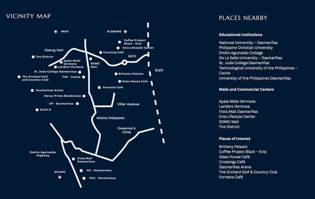 The development enjoys prime accessibility via major road networks including Daang Hari Road, a major corridor connecting Las Piñas, Alabang, Bacoor, Imus, and General Trias, and the newly opened Villar Avenue, a 10-lane boulevard designed as the main artery of Villar City with direct connectivity to Cavite’s university and business districts. The area is also highly accessible via MCX (Muntinlupa-Cavite Expressway), with convenient connections to SLEX, Molino-Paliparan Road, and Aguinaldo Highway, linking residents to Metro Manila and major provincial growth centers.